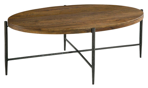 25800• Oval coffee table with slab edge top and shaped shelf underneath. • Mindi solids and veneers. • Arlington Heights finish.