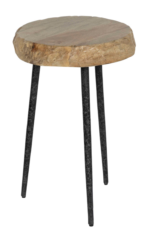 28794Live edge chairside table mounted on steel legs. Materials: Solid Mango with solid steel legs. Natural finish with white glaze on wood, and charco...