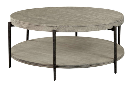 25802• Round Coffee Table with slab top and shaped shelf underneath. • Mindi solids and veneers. • Arlington Heights finish.