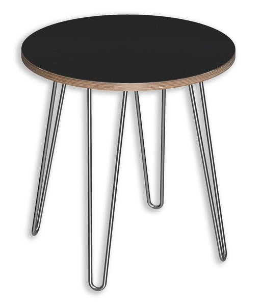 991061DTEnhance your office with this stylish end table. The circularDesignerPly top is modernized with mid-century multi-ply grain edges and fourhairpin l...