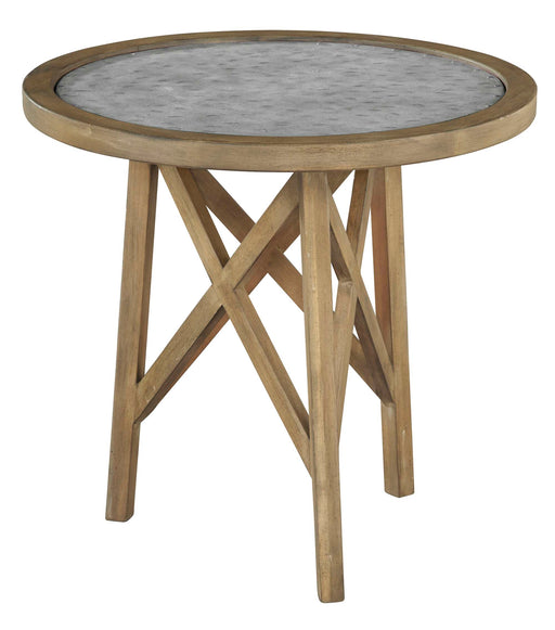 27872Acacia solids and veneers. Galvanized metal top with tack border. Three legs with cross brace X design. Wire brushed, natural weathered Spec...
