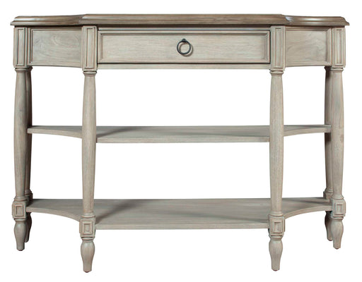23304Acacia veneers and select solids. Tapered fluted legs with turned tops. One drawer. Rustic antique brass hardware. Natural Wellington Hall fini...
