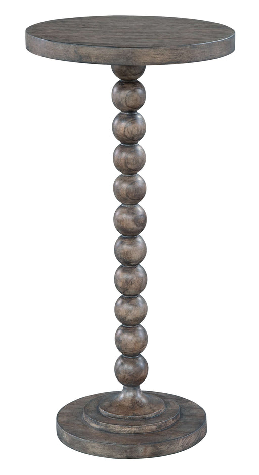 25202Mindi veneers and select mindi solids. Tapered pedestal with urn turning. Driftwood finish. Diameter 22" Height 26"