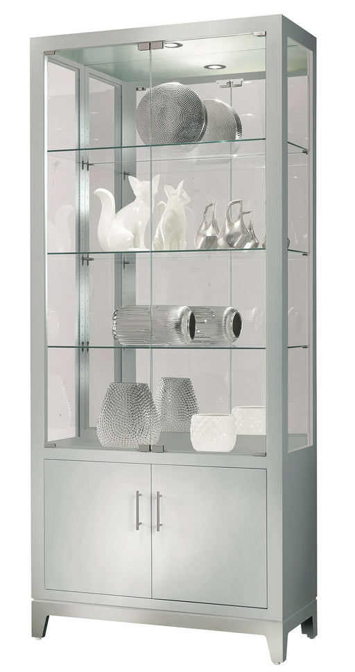 680751Silver wood finish on select hardwoods and veneers. This flat top curio features hinged glass doors with satinnickel hinges and pulls. A lower sto...