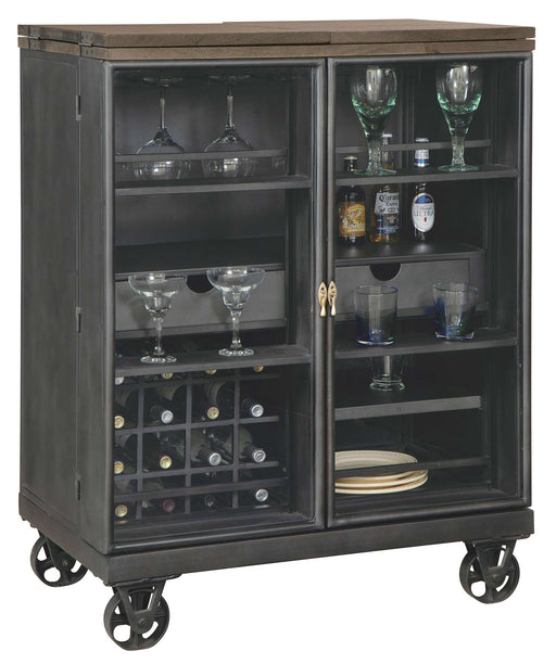 695280Burnished Oak finish on select hardwoods and veneers, wire-brushed for an aged appearance. This portable bar includes four casters and is finished...