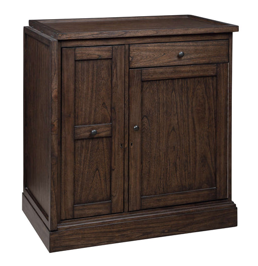 695138This handsome wine cabinet features a Rustic Hardwood finish on select hardwoods and veneers, burnished brass metal accents, and a burnished bron...