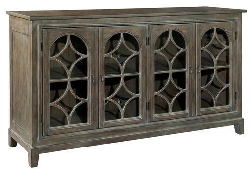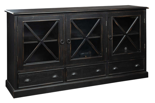 28530• Select veneers and solids. • Four-door storage with wood-framed glass and pewter hardware. • Adjustable shelf behind each pair of doors. • Pow...