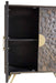 - Chest of select solids and veneers features a wooden raised strip design with two doors and one shelf behind them.