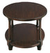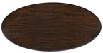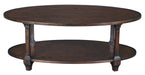 - Oval coffee table with a shelf supported by four rectangular posts along the perimeter.