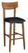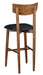- Features an arched wooden backrest with flared round wooden legs, back uprights, and a black faux leather cushioned seat.