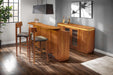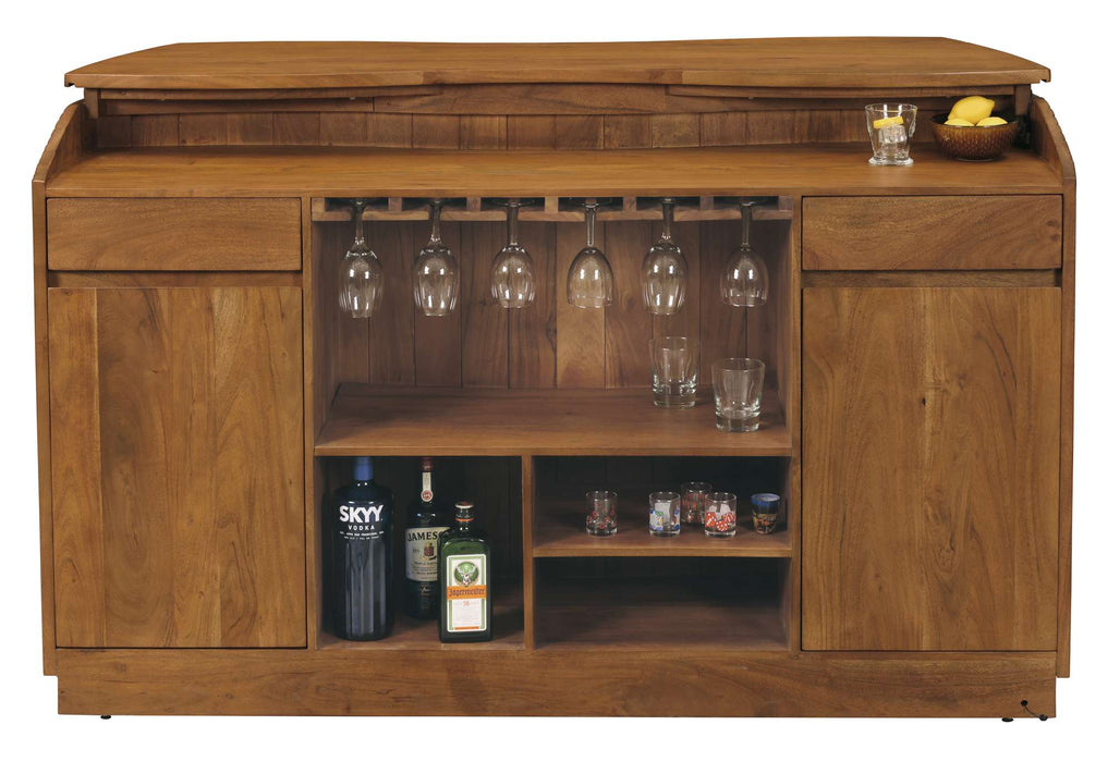 - This unique bar features a light brown matte finish on solid Acacia hardwood with knots and distressing. Vertical wooden bead moldings are applied along the fascia, and a simple plinth wooden base supports it.
