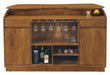 - The wood shelf below houses a wooden stemware rack that holds up to 18 large wine glasses and has storage for glassware, spirits, and other accessories.