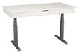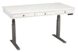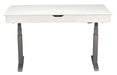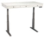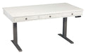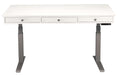 Elevate your workspace with our Custom Adjustable Height Desk, featuring a sleek metal base that offers adjustable height settings for optimal comfort. Adorned with dentil molding under the top edge, this desk exudes sophistication and attention to detail.