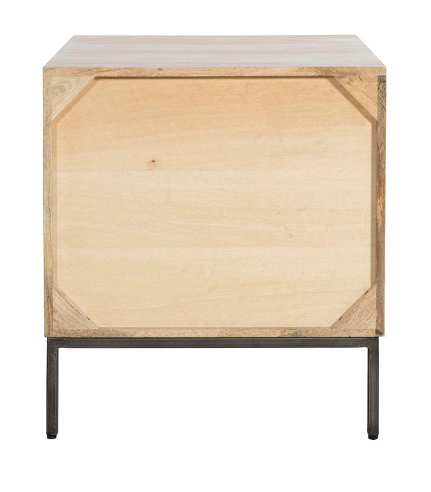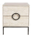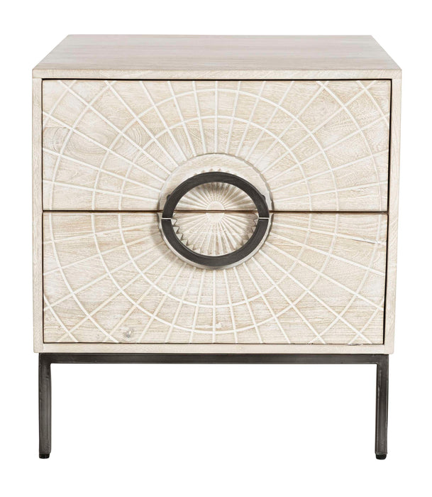 - End table with two drawers that have a sunburst design carved into the top face overlaying both.