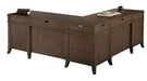 - Left Side: Drop front center drawer for keyboard, laptop or tablet storage. One box drawer, one door with power director and pull-out tray, and pull-out writing surface.