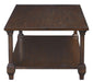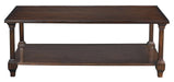 - Four square posts along the perimeter support a rectangular coffee table with a shelf.