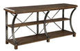 - X-stretcher pewter metal supports on the back of the sofa table and a mid-height shelf for extra storage.