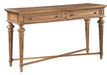 Acacia veneers and select solids. Tapered fluted legs with turned tops. Two drawers. Rustic antique brass hardware. Natural Wellington Hall finish. Dentil molding. Some assembly required. Width 56" (142 cm) Depth 18" (46 cm) Height 32" (81 cm)